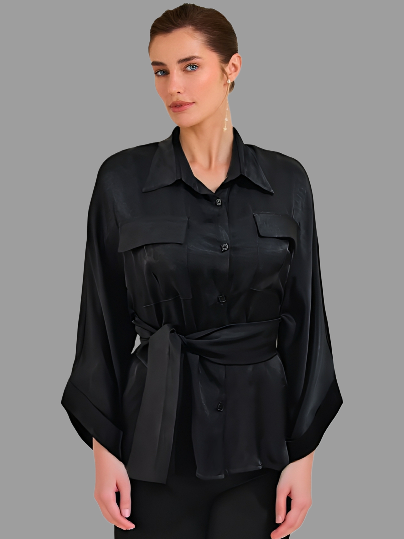 شومیز زنانه شیک ساتن ابریشم مشکی آسیتن دار مدل کمردار برند MODAMOON