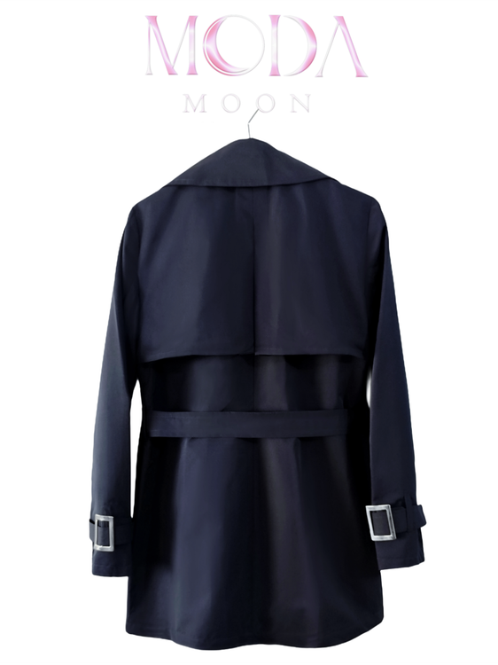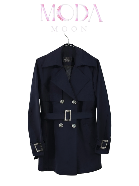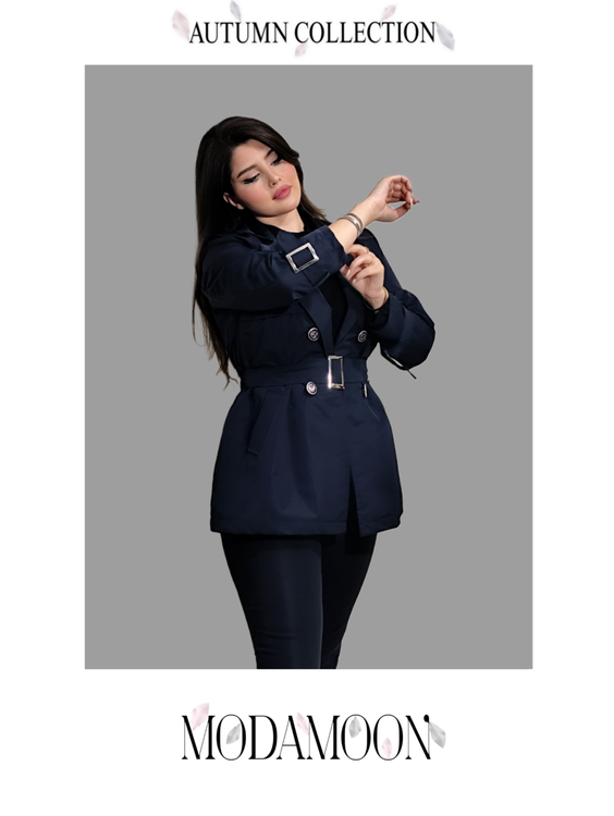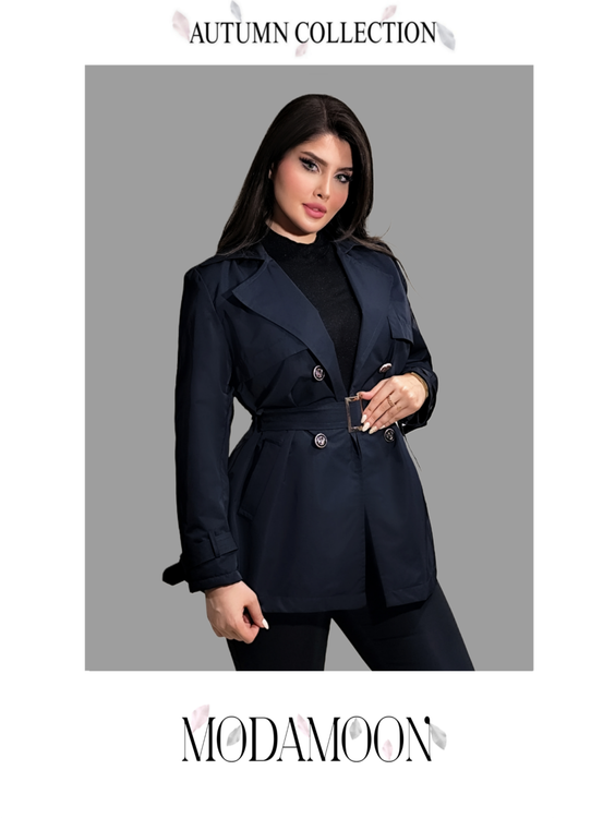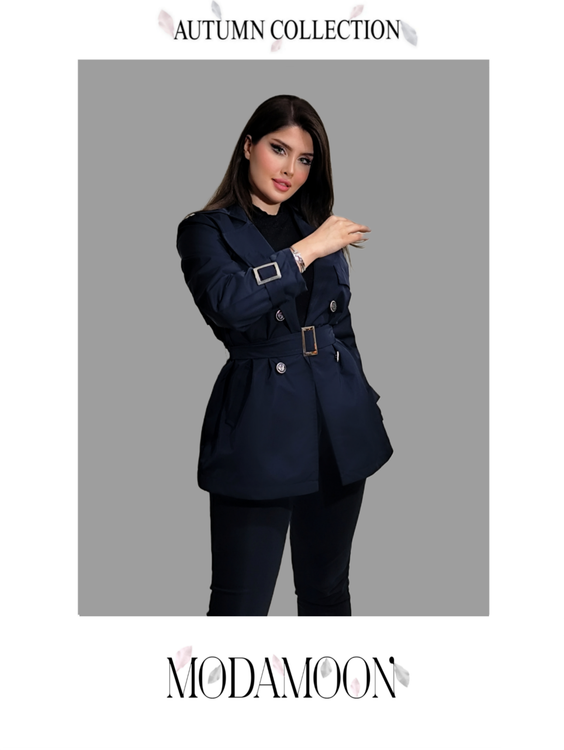 بارانی پاییزه سرمه ای کوتاه زنانه کمربند دار ، ضد چروک و شیک برند MODAMOON