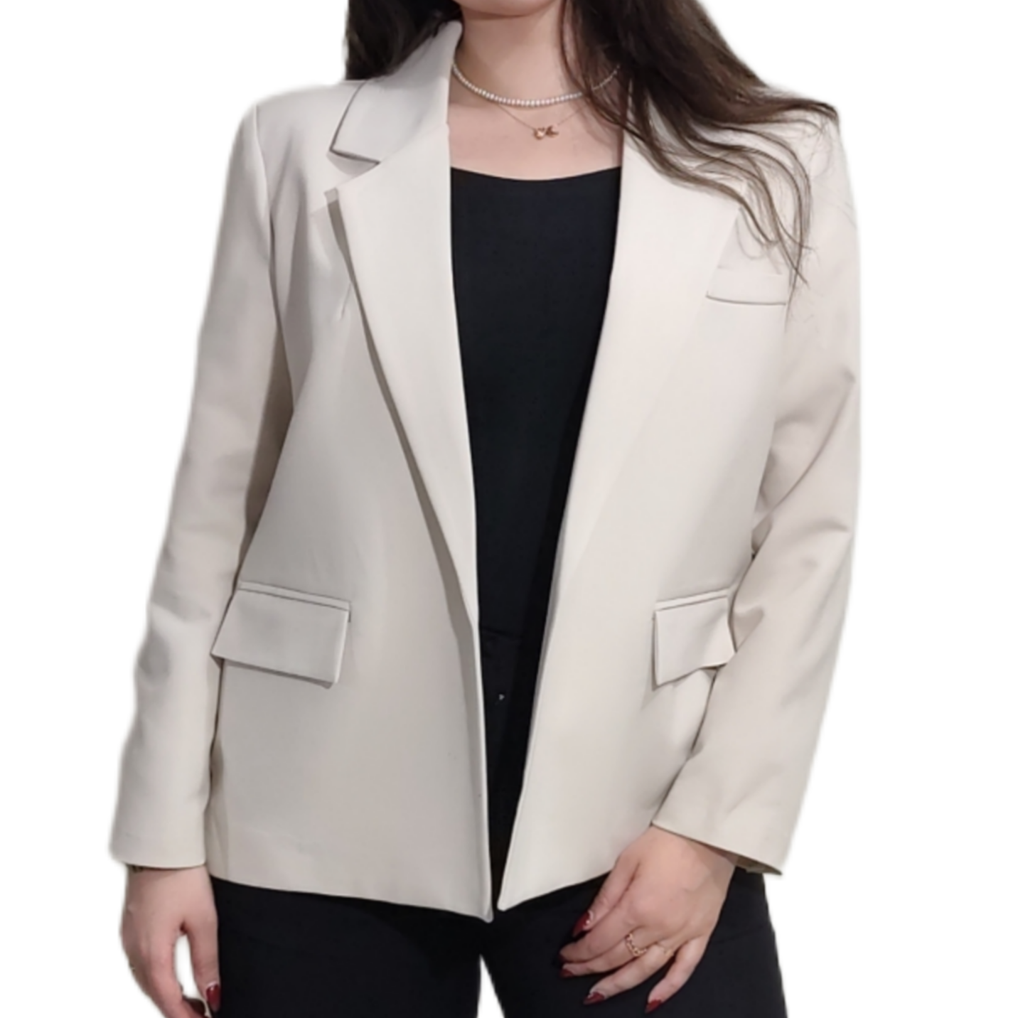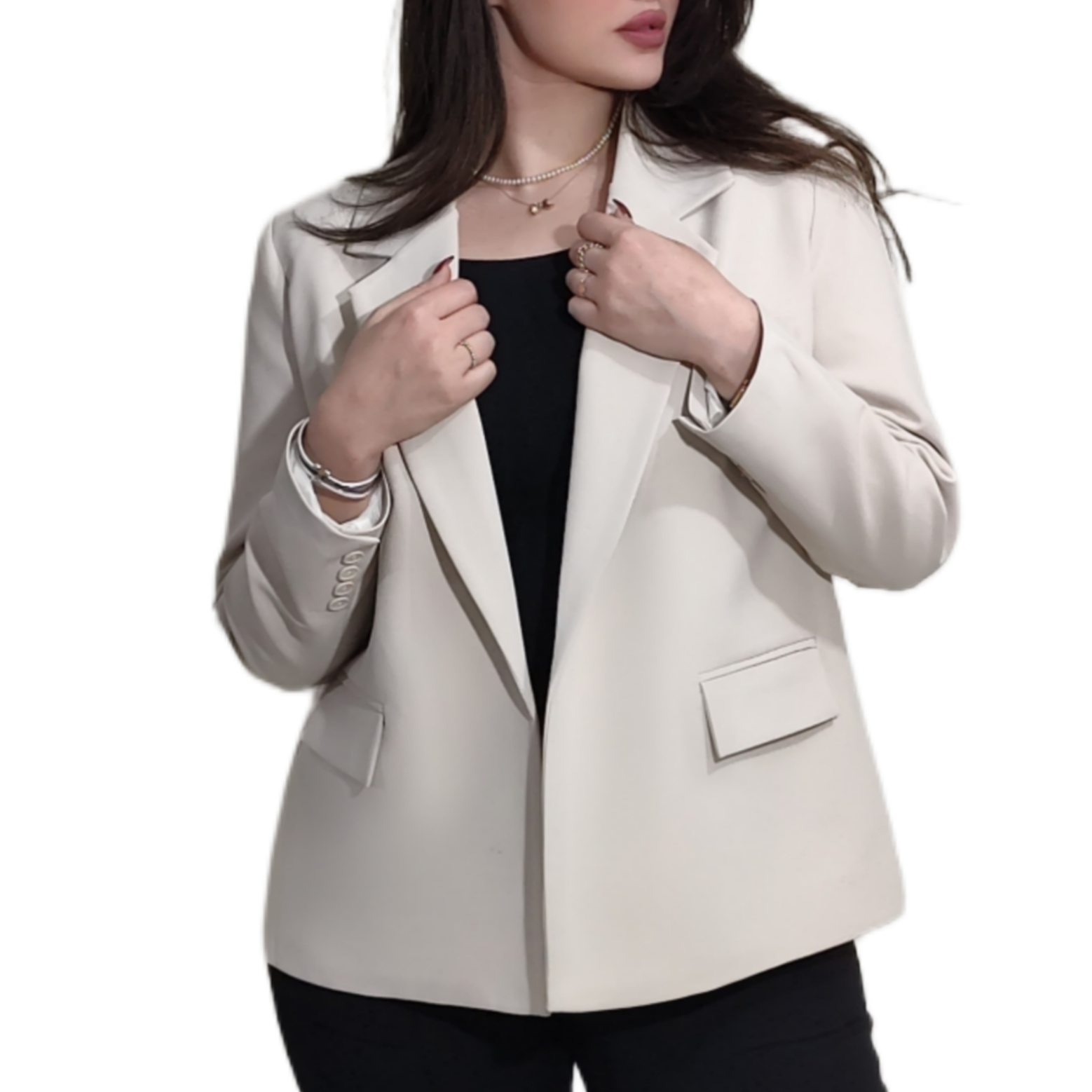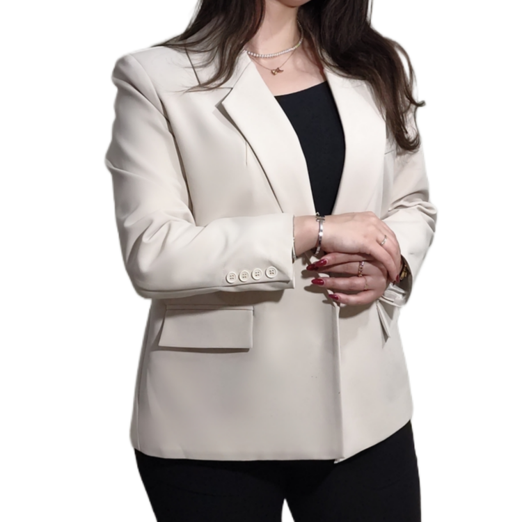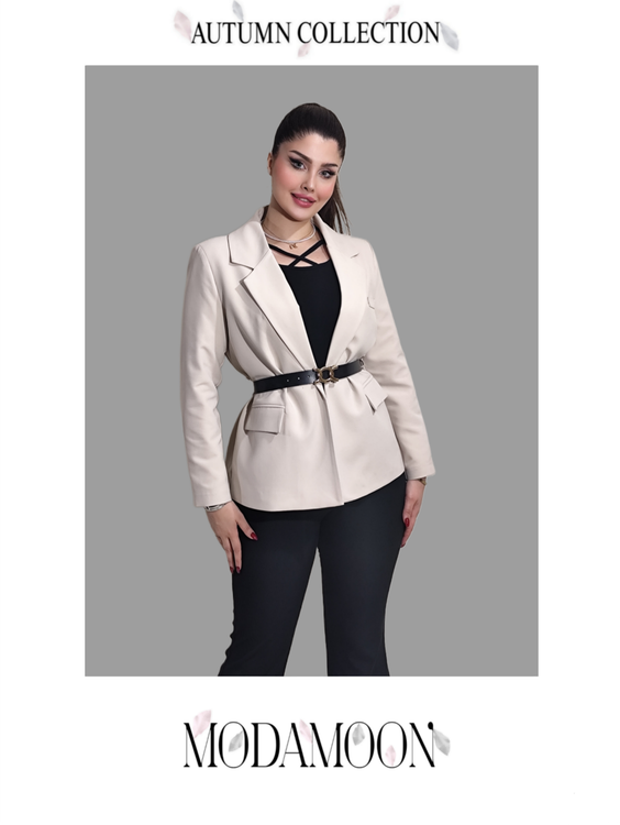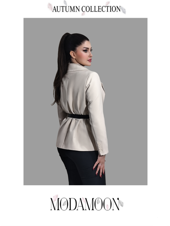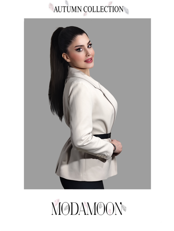 کت کوتاه پاییزه زنانه برند MODAMOON با رنگ خاص استخوانی و طراحی لوکس، ترکیبی از ظرافت و استایل مدرن است.